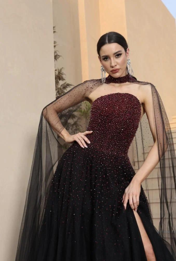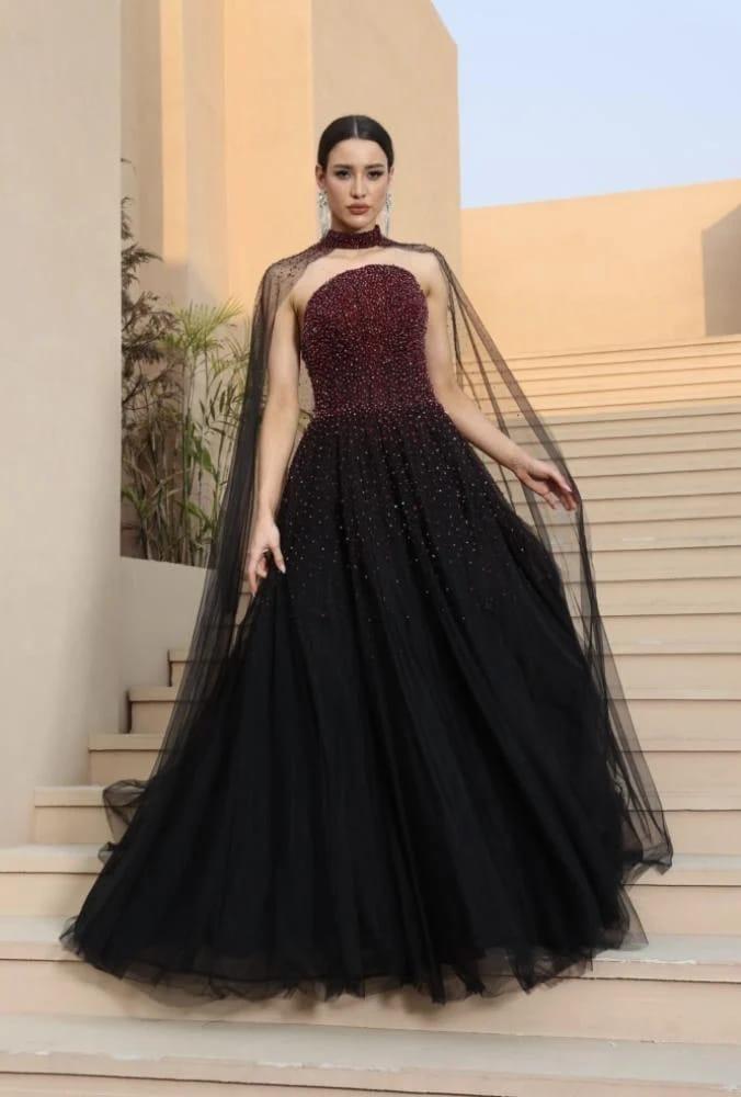 فستان سهرة بيج لماع مع أسود، طويل ومطرز، بدون أكمام، ويتميز بشال خلفي أنيق. اللون البيج اللامع يضيف لمسة من الفخامة، بينما يضيف اللون الأسود لمسة من الرقي والجمال.