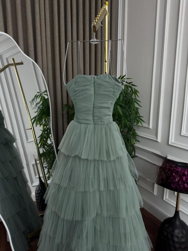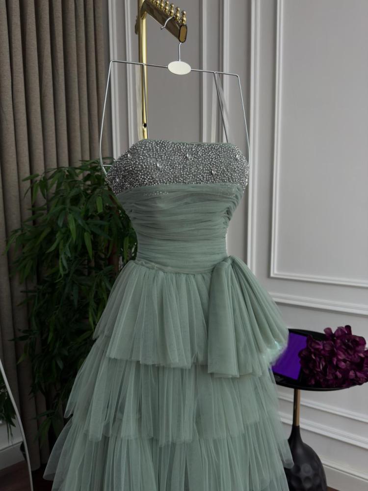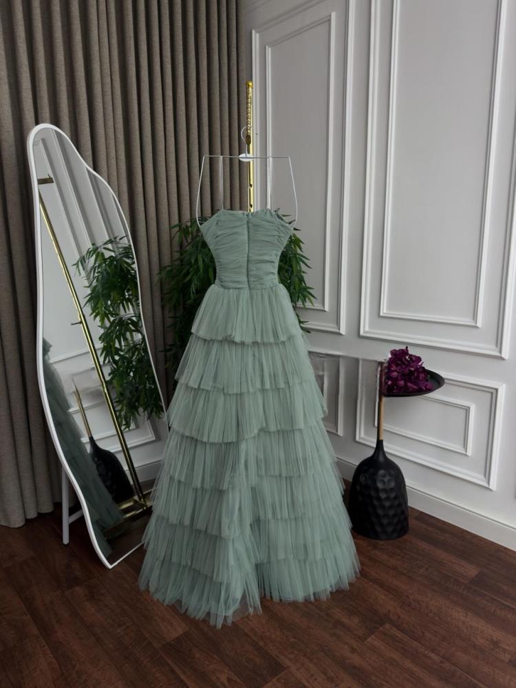 "فستان سهرة بلون أخضر فستقي (Mint Green) ساحر! الصدر مزين بتطريز كريستالي لامع وكثيف، وتنسدل منه تنورة مبهرة ذات طبقات متتالية من التُلّ الناعم، تمنح الفستان حركة وحجماً درامياً. تصميم أنثوي ملكي يجمع بين الرقة والفخامة! أنتِ تستحقين التميز، لا تنتظري فالجمال لا يُكرر نفسه! استغلي الفرصة لكي تتألقين بإطلالة الحفل الأجمل قبل أن تنفد الكمية من هذا اللون النادر!"